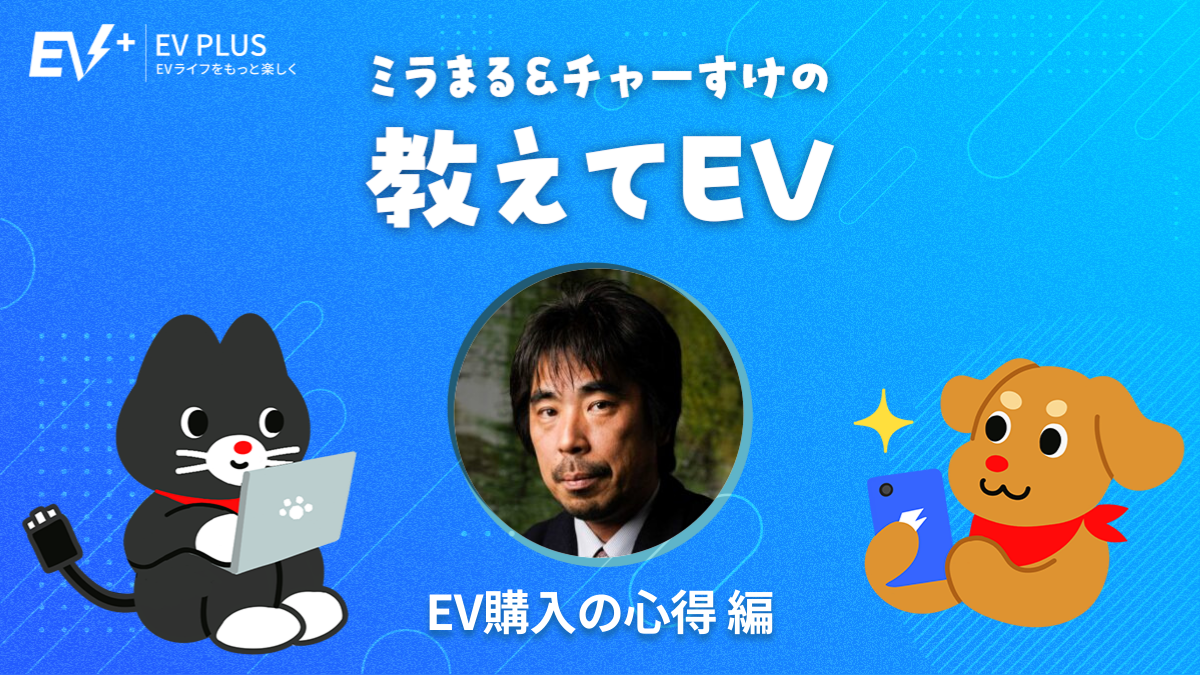 ミライズエネチェンジの公式キャラクターミラまるとチャーすけ、編集部員のユミが電気自動車(EV)に関する疑問を専門家に聞く「ミラまる&チャーすけの教えてEV」。