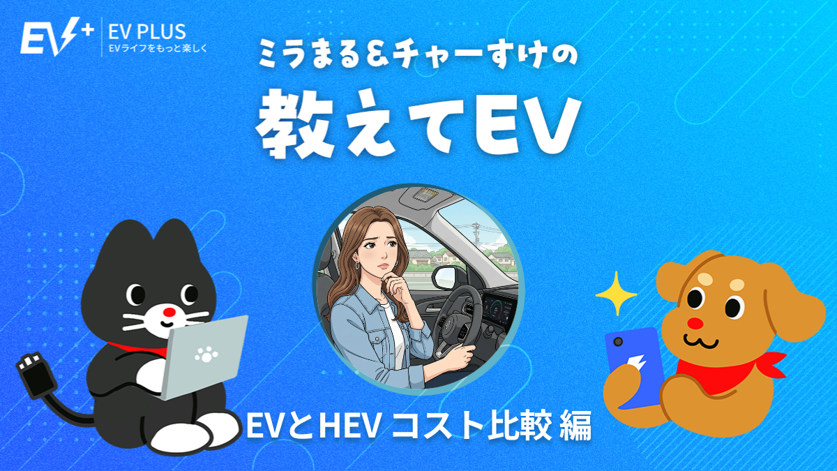 ミライズエネチェンジの公式キャラクター・ミラまるとチャーすけ、編集部員のユミがEVに関する疑問を解決する「ミラまる&チャーすけの教えてEV」。