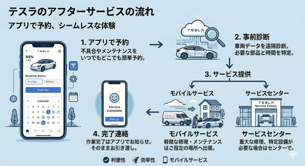 テスカステスラは直営のサービスセンターが全国にあって、スマートフォンのアプリから整備予約をします。