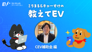 ミライズエネチェンジの公式キャラクターミラまるとチャーすけ、編集部員のユミが電気自動車(EV)に関する疑問を専門家に聞く「ミラまる&チャーすけの教えてEV」。