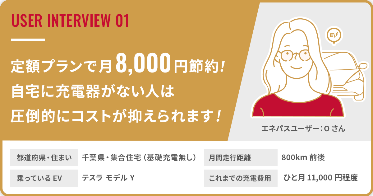 今回はリリース直後からエネチェンジパスポートを利用いただいている千葉県在住のOさんに、利用された感想やひと月の充電費用の変化、サービスの魅力をうかがいました。