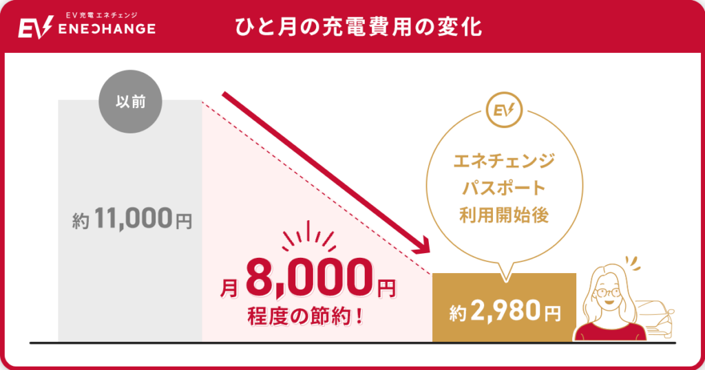 Oさん 毎月11,000円程度かかっていた充電費用が、エネチェンジパスポートの利用に切り替えたことで月2,980円になったので、月8,000円程度も節約できるようになりました。