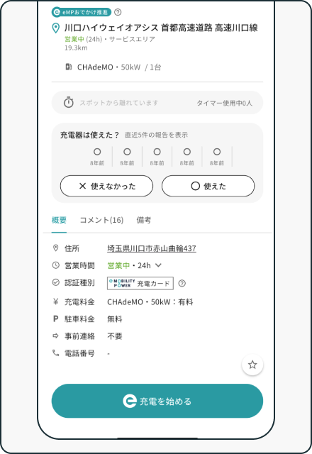 さらにCHAdeMOの充電出力を選択することで、対象スポットを50kW以下、50kW超などの条件で絞り込むこともできます。