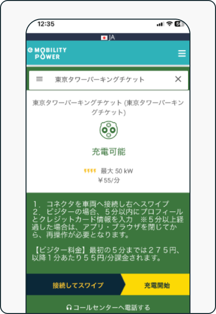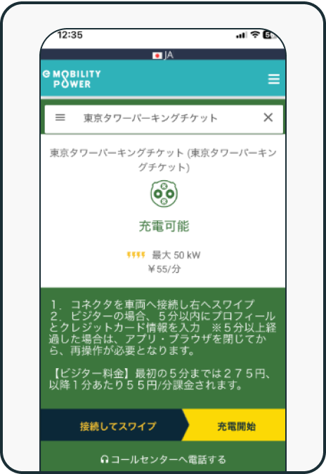 アプリ内の「充電する」ボタンまたは、対象スポットページの「ビジター充電を始める」ボタンをタップします。