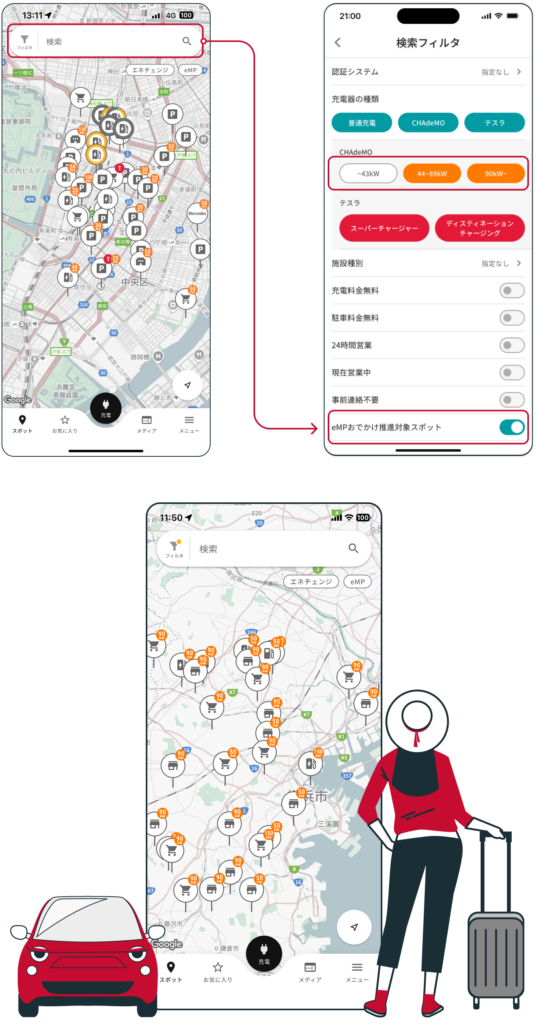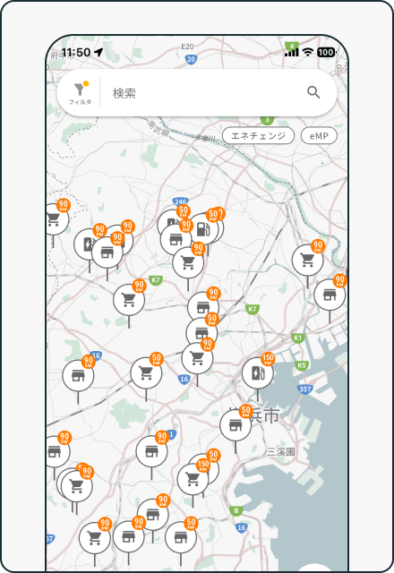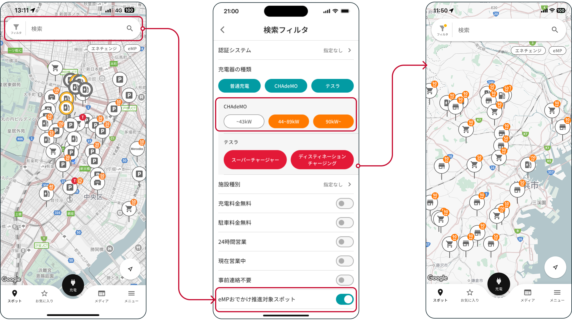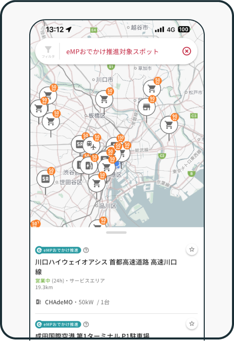 「EV充電エネチェンジ」アプリ内の検索フィルターから、「eMPおでかけ推進対象スポット」の項目をオンにして適用すると、対象の充電器が一覧で表示されます。
